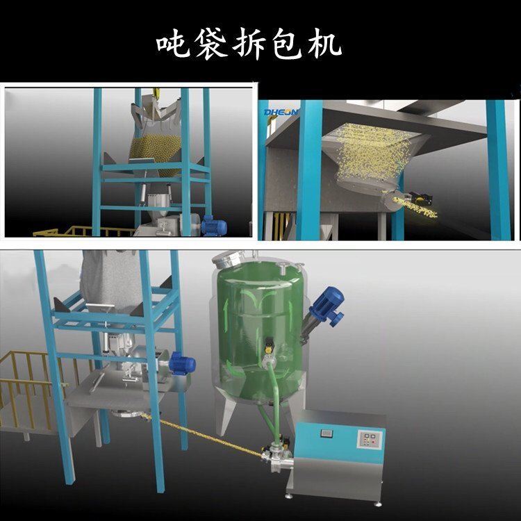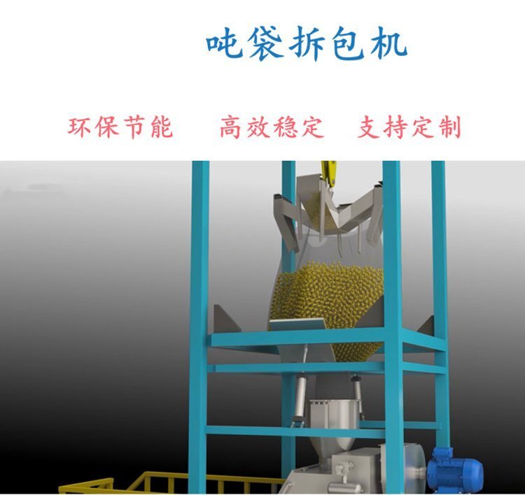 噸袋拆包機(jī)用來(lái)實(shí)現(xiàn)袋裝散裝物料的卸料功能,為半自動(dòng)操作。將噸包中的原料高效、環(huán)保、節(jié)省人工的卸放到客戶指定設(shè)備中的設(shè)備。傳統(tǒng)的噸包到料方式是直接解開(kāi)或者劃開(kāi)噸包,將物料直接傾倒至客戶設(shè)備進(jìn)料口,造成粉塵大面積分散,對(duì)環(huán)境及操作人員都存在危害,碰到有易爆的原料,如淀粉、面粉等,會(huì)增加粉塵爆炸的可能性。噸袋開(kāi)袋機(jī)解決了這一問(wèn)題。我們根據(jù)用戶使用的噸包尺寸、類型、現(xiàn)場(chǎng)工況,為客戶選擇所需拆包機(jī)的型號(hào)。